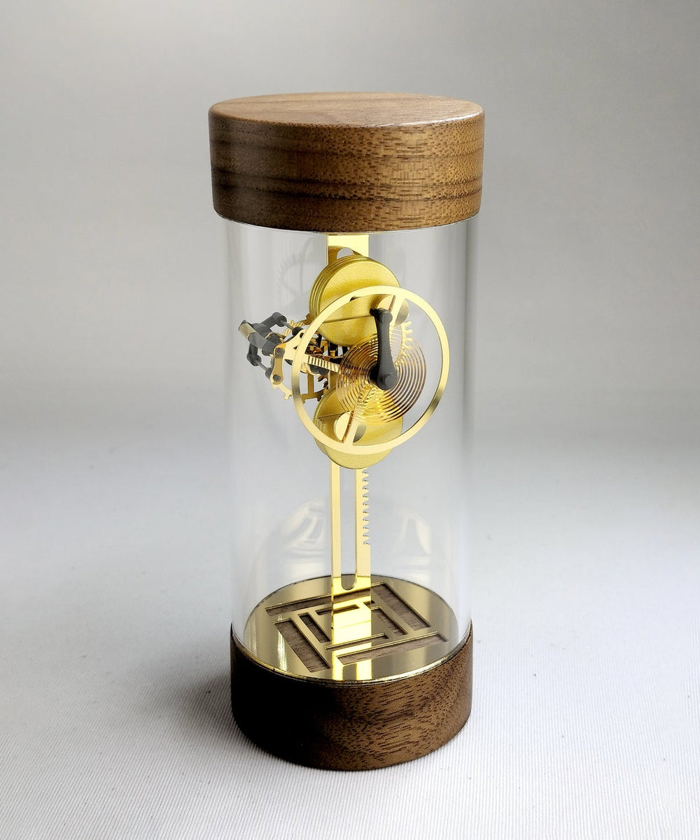 “Oscilloglass” is a mechanical hourglass that activates once flipped over. Each of the components sealed inside the glass cylinder is slowly pulled to the bottom of the glass due to the force of Earth's gravity. The falling speed is controlled by the same principle as a mechanical clock, slowly descending until it eventually stops.